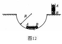 17.(14分)如图12所示,质量均为m的两球A、B间有压缩的轻、短弹簧处于锁定状态,放置在水平面上竖直光滑的发射管内(两球的大小尺寸和弹簧尺寸都可忽略,他们整体视为质点),解除锁定时,A球能上升的最大高度为H,现在让两球包括锁定的弹簧从水平面出发,沿光滑的半径为R的半圆槽从右侧由静止开始下滑,至最低点时,瞬间锁定解除,求A球离开圆槽后能上升的最大高度。