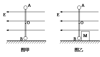 (3)如果开始时在B小球右侧紧贴放置一个质量为M的光滑绝缘木块,如图乙所示,整个装置重新从竖直位置由静止开始转动,推动木块沿水平面滑动。求转动30°时,绝缘木块的速率是多少?(木块和小球保持接触)