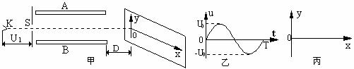 12. 示波器是一种多功能电学仪器,可以在荧光屏上显示出被检测的电压波形,它的工作原理可等效成下列情况:(如图甲所示)真空室中电极K发出电子(初速不计),经过电压为U1的加速电场后,由小孔S沿水平金属板A、B间的中心线射入板中,板长为L,两板间距离为d,在两板间加上如图乙所示的正弦交变电压,周期为T,前半个周期内B板的电势高于A板的电势,电场全部集中在两板之间,且分布均匀.在每个电子通过极板的极短时间内,电场视作恒定的.在两极板右侧且与极板右端相距D处有一个与两板中心线(图中虚线)垂直的荧光屏,中心线正好与屏上坐标原点相交.当第一个电子到达坐标原点O时,使屏以速度v沿负x方向运动,每经过一定的时间后,在一个极短时间内它又跳回到初始位置,然后重新做同样的匀速运动.(已知电子的质量为m,带电量为e,不计电子重力)求: