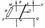 9.如图所示,PQ、MN是固定的水平放置的足够长的U形金属导轨,导轨的宽度为L,整个导轨处于竖直向上、磁感应强度为B的匀强磁场中,导轨左端连接一阻值为R的电阻器,在导轨上放一质量为m的金属棒ab,导轨与金属棒电阻均不计,给ab一水平初速度v0,使其向右运动,最后ab静止在导轨上,
