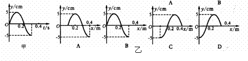 6、质点以坐标原点O为中心位置在y轴上做简谐运动,其振动图象如图甲所示,振动在介质中产生的简谐横波沿x轴正方向传播,波速为1. 0 m/s。0. 3 s后,此质点立即停止运动,再经过0. 1 s后的波形图是图乙中的( )