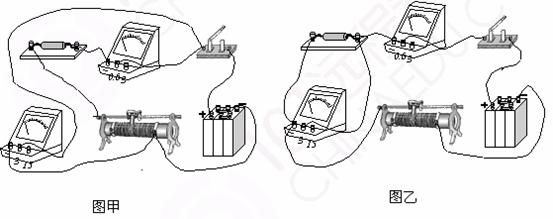 (二)下面甲、乙两图中,一个是伏安法测电阻的实物连接图,另一个是用电流表和电压表测定电源电动势和内阻的实物连接图。
