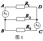 如图6所示为一部分电路,当把电压恒定的电源接在A、C两点时,理想电流表A1、A2示数分别为I1和I2,且I1 :I2=9:5;若把此电源接在B、D两点时,电流表A1示数为I1′,且 I1 :I1′=9:2; R1、R2、消耗的功率分别为P1和P2,求: