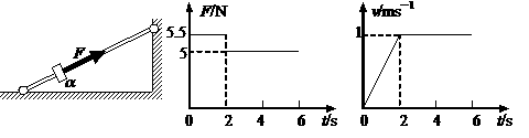 23、(16分)固定光滑细杆与地面成一定倾角,在杆上套有一个光滑小环,小环在沿杆方向的推力F作用下向上运动,推力F与小环速度v随时间变化规律如图所示,取重力加速度g=10m/s2。求: