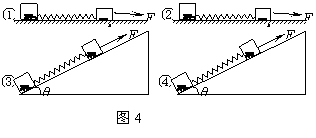如图4,用相同材料做成的质量分别为m1、m2的两个物体中间用一轻弹簧连接。在下列四种情况下,相同的拉力F均作用在m1上,使m1、m2作加速运动:①拉力水平,m1、m2在光滑的水平面上加速运动。②拉力水平,m1、m2在粗糙的水平面上加速运动。③拉力平行于倾角为θ的斜面,m1、m2沿光滑的斜面向上加速运动。④拉力平行于倾角为θ的斜面,m1、m2沿粗糙的斜面向上加速运动。以△l1、△l2、△l3、△l4依次表示弹簧在四种情况下的伸长量,则有( )