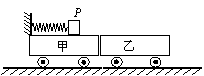 17.(16分)如图所示,光滑水平面上放置质量均为M=2kg的甲、乙两辆小车,两车之间通过一感应开关相连(当滑块滑过感应开关时,两车自动分离),甲车上表面光滑,乙车上表面与滑块P之间的动摩擦因数μ=0.5.一根通过细线拴着且被压缩的轻质弹簧固定在甲车的左端,质量为m=1kg的滑块P(可视为质点)与弹簧的右端接触但不相连,此时弹簧的弹性势能E0=10J,弹簧原长小于甲车长度,整个系统处于静止状态.现剪断细线,求: