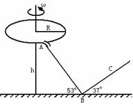 15、(14分)如图所示,一水平圆盘绕过圆心的竖直轴转动,圆盘边缘有一质量m=1.0kg的小滑块。当圆盘转动的角速度达到某一数值时,滑块从圆盘边缘滑落,经光滑的过渡圆管进入轨道ABC。以知AB段斜面倾角为53°,BC段斜面倾角为37°,滑块与圆盘及斜面间的动摩擦因数均μ=0.5 ,A点离B点所在水平面的高度h=1.2m。滑块在运动过程中始终未脱离轨道,不计在过渡圆管处和B点的机械能损失,最大静摩擦力近似等于滑动摩擦力,取g=10m/s2,sin37°=0.6; cos37°=0.8