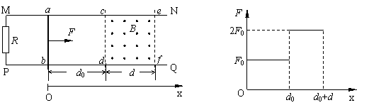 16. (14分) 如图所示,光滑的平行水平金属导轨MN、PQ相距l,在M点和P点间连接一个阻值为R的电阻,在两导轨间cdfe矩形区域内有垂直导轨平面竖直向上、宽为d的匀强磁场,磁感应强度为B。一质量为m、电阻为r、长度也刚好为l的导体棒ab垂直搁在导轨上,与磁场左边界相距d0。现用一个水平向右的力F拉棒ab,使它由静止开始运动,棒ab离开磁场前已做匀速直线运动,棒ab与导轨始终保持良好接触,导轨电阻不计,F随ab与初始位置的距离x变化的情况如图,F0已知。求: