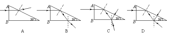 如图所示,一束光从空气垂直射到直角棱镜的AB面上,已知棱镜材料的折射率为1.4,则这束光进入棱镜后的光路图应为下面四个图中的