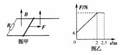 14如图(甲)所示,一对平行光滑轨道放置在水平面上,两轨道相距l=1m,两轨道之间用R=2Ω的电阻连接,一质量m=0.5kg的导体杆与两轨道垂直,静止放在轨道上,杆及轨道的电阻均可忽略不计,整个装置处于磁感应强度B=2T的匀强磁场中,磁场方向垂直轨道平面向上,现用水平拉力沿轨道方向拉导体杆,拉力F与导体杆运动的位移s间的关系如图(乙)所示,当拉力达到最大时,导体杆开始做匀速运动,当位移s=2.5m时撤去拉力,导体杆又滑行了s′=2m停下,求: