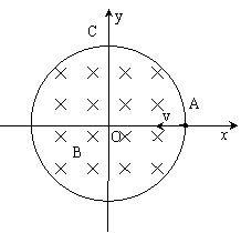 17、(16分)在以坐标原点O为圆心、半径为r的圆形区域内,存在磁感应强度应大小为B、方向垂直于纸面向里的匀强磁场,如图所示。一个不计重力的带电粒子从磁场边界与x轴的交点A处以速度v沿-x方向射入磁场,它恰好从磁场边界的交点C处沿+y方向飞出。