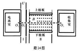 有人设想用题24图所示的装置来选择密度相同、大小不同的球状纳米粒子。粒子在电离室中电离后带正电,电量与其表面积成正比。电离后,粒子缓慢通过小孔O1进入极板间电压为U的水平加速电场区域I,再通过小孔O2射入相互正交的恒定匀强电场、磁场区域II,其中磁场的磁感应强度大小为B,方向如图。收集室的小孔O3与O1、O2在同一条水平线上。半径为r0的粒子,其质量为m0、电量为q0,刚好能沿O1O3直线射入收集室。不计纳米粒子重力。(