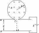 如图所示,在半径为R的绝缘圆筒内有匀强磁场,方向垂直纸面向里,圆筒正下方有小孔C与平行金属板M、N相通。两板间距离为d,两板与电动势为E的电源连接,一带电量为-q、质量为m的带电粒子(重力忽略不计),在C点正下方紧靠N板的A点,无初速经电场加速后从C点进入磁场,与圆筒发生两次碰撞后从C点射出。已知带电粒子与筒壁的碰撞无电荷量的损失,且碰撞后以原速率返回。求:
