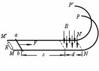 如图所示,两根正对的平行金属直轨道MN、M´N´位于同一水平面上,两轨道之间的距离l=0.50m。轨道的MM´端之间接一阻值R=0.40Ω的定值电阻,NN´端与两条位于竖直面内的半圆形光滑金属轨道NP、N´P´平滑连接,两半圆轨道的半径均为R0=0.50m。直轨道的右端处于竖直向下、磁感应强度B=0.64 T的匀强磁场中,磁场区域的宽度d=0.80m,且其右边界与NN´重合。现有一质量m=0.20kg、电阻r=0.10Ω的导体杆ab静止在距磁场的左边界s=2.0m处。在与杆垂直的水平恒力F=2.0N的作用下ab杆开始运动,当运动至磁场的左边界时撤去F,结果导体杆ab恰好能以最小速度通过半圆形轨道的最高点PP´。已知导体杆ab在运动过程中与轨道接触良好,且始终与轨道垂直,导体杆ab与直轨道之间的动摩擦因数μ=0.10,轨道的电阻可忽略不计,取g=10m/s2,求: