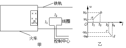 9.2006年7月1日,世界上海拔最高、线路最长的青藏铁路全线通车,青藏铁路安装的一种电磁装置可以向控制中心传输信号,以确定火车的位置和运动状态,其原理是将能产生匀强磁场的磁铁安装在火车首节车厢下面,如图甲所示(俯视图),当它经过安放在两铁轨间的线圈时,线圈便产生一个电信号传输给控制中心.线圈边长分别为l1和l2,匝数为n,线圈和传输线的电阻忽略不计.若火车通过线圈时,控制中心接收到线圈两端的电压信号u与时间t的关系如图乙所示(ab、cd均为直线),t1、t2、t3、t4是运动过程的四个时刻,则火车( )