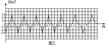 (10分)某同学在实验室里熟悉各种仪器的使用。他将一条形磁铁放在转盘上,如图甲所示,磁铁可随转盘转动,另将一磁感强度传感器固定在转盘旁边,当转盘(及磁铁)转动时,引起磁感强度测量值周期性地变化,该变化与转盘转动的周期一致。经过操作,该同学在计算机上得到了如图乙所示的图像。