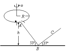 (14分)如图所示,一水平圆盘绕过圆心的竖直轴转动,圆盘边缘有一质量m=1.0kg的小滑块。当圆盘转动的角速度达到某一数值时,滑块从圆盘边缘滑落,经光滑的过渡圆管进入轨道ABC。已知AB段斜面倾角为53°,BC段斜面倾角为37°,滑块与圆盘及斜面间的动摩擦因数均μ=0.5 ,A点离B点所在水平面的高度h=1.2m。滑块在运动过程中始终未脱离轨道,不计在过渡圆管处和B点的机械能损失,最大静摩擦力近似等于滑动摩擦力,取g=10m/s2,sin37°=0.6;