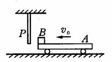 ( 15分 )如图所示,P是固定的竖直挡板,A是置于光滑平面上的平板小车(小车表面略低于挡板下端),B是放在小车最左端表面上的一个可视为质点的小物块.开始时,物块随小车一起以相同的水平速度vo 向左运动,接着物块B与挡板发生了第一次碰撞,碰后物块B相对于车静止时的位置离小车最左端的距离等于车长的3/4,此后物块又与挡板发生了多次碰撞,最后物块恰好未从小车上滑落.若物块与小车表面间的动摩擦因数是个定值,物块与挡板发生碰撞时无机械能损失且碰撞时间极短,试确定小车与物块的质量关系.