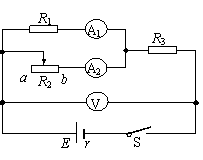 在如图所示的电路中,E为电源电动势,r为电源内阻,R1和R3均为定值电阻,R2为滑动变阻器。当R2的滑动触点在a端时合上开关S,此时三个电表A1、A2和V的示数分别为I1、I2和U。现将R2的滑动触点向b端移动,则三个电表示数的变化情况是( )