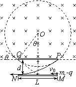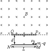 如图所示,MN、PQ是平行金属板,板长为L,两板间距离为d,在PQ板的上方有垂直纸面向里的匀强磁场。一个电荷量为q、质量为m的带负电粒子以速度v0从MN板边缘沿平行于板的方向射入两板间,结果粒子恰好从PQ板左边缘飞进磁场,然后又恰好从PQ板的右边缘飞进电场。不计粒子重力。试求: