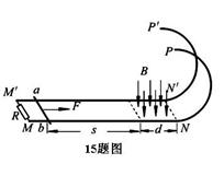 如图所示,两根正对的平行金属直轨道MN、M´N´位于同一水平面上,两轨道之间的距离l=0.50m.轨道的MM´端之间接一阻值R=0.40Ω的定值电阻,NN´端与两条位于竖直面内的半圆形光滑金属轨道NP、N´P´平滑连接,两半圆轨道的半径均为R0=0.50m.直轨道的右端处于竖直向下、磁感应强度B=0.64 T的匀强磁场中,磁场区域的宽度d=0.80m,且其右边界与NN´重合.现有一质量m=0.20kg、电阻r=0.10Ω的导体杆ab静止在距磁场的左边界s=2.0m处.在与杆垂直的水平恒力F=2.0N的作用下ab杆开始运动,当运动至磁场的左边界时撤去F,结果导体杆ab恰好能以最小速度通过半圆形轨道的最高点PP´.已知导体杆ab在运动过程中与轨道接触良好,且始终与轨道垂直,导体杆ab与直轨道之间的动摩擦因数μ=0.10,轨道的电阻可忽略不计,取g=10m/s2,求:⑴导体杆刚进入磁场时,通过导体杆上的电流大小和方向;⑵导体杆穿过磁场的过程中通过电阻R上的电荷量;⑶导体杆穿过磁场的过程中整个电路中产生的焦耳热.