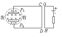 如图示,连接平行金属板P1和P2(板面垂直于纸面)的导线的一部分CD和另一连接电池的回路的一部分GH平,CD和GH均在纸平面内,金属板置于磁场中,磁场方向垂直于纸面向里,当一束等离子体射入两金属板之间时,CD段导线将受到力的作用.