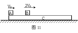 如图11所示,C是放在光滑的水平面上的一块木板,木板的质量为3m,在木板的上面有两块质量均为m的小木块A和B,它们与木板间的动摩擦因数均为μ。最初木板静止,A、B两木块同时以方向水平向右的初速度V0和2V0在木板上滑动,木板足够长, A、B始终未滑离木板。求: