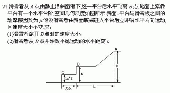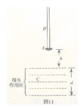 .在地面上方,一小圆环A套在一条均匀直杆B上,A和B的质量均为m,它们之间的滑动摩擦力f =0.5mg.开始时A处于B的下端,B竖直放置.在A的下方h=0.20m处,存在一个“相互作用”区域C,区域C的高度d =0.30m,固定在空中如图11中划有虚线的部分.当A进入区域C时,A就受到方向向上的恒力F作用,F =2mg.区域C对杆B不产生作用力.A和B一起由静止开始下落,已知杆B落地时A和B的速度相同.不计空气阻力,重力加速度g=10m/s2.求杆B的长度l至少应为多少?