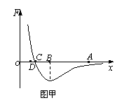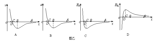 如图甲所示,甲分子固定在坐标原点O,乙分子位于x轴上,甲分子对乙分子的作用力与两分子间距离的关系如图甲中曲线所示。F>0为斥力,F<0为引力。A、B、C、D为x轴上四个特定的位置。现把乙分子从A处由静止释放,图乙中A、B、C、D四个图分别表示乙分子的速度、加速度、势能、动能与两分子间距离的关系,其中大致正确的是: