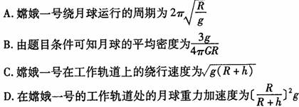 9.2007年10月24日,我国发射了第一颗探月卫星--“嫦娥一号”,嫦娥一号发射后经多次变轨,最终进入距月面h=200km的工作轨道绕月球做匀速圆周运动,开始进行科学探测活动.设月球半径为R,月球表面的月球重力加速度为g,万有引力常量为G,则下列说法正确的是 ( ABD )