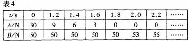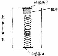 (10分)如图所示是一个利用压力差来测量加速度的实验装置。在一个具有坚硬外壳的长方形盒内的上、下底板上各装配一个压力传感器A、B,其间用一轻弹簧将一个物块顶在传感器A上,弹簧的下端抵在传感器B上。整个装置处于静止状态时,A、B传感器示数分别为30N、50N。从t=0时刻起实验装置沿竖直方向开始运动,将两个传感器送出的压力数据记录下来,得表4。(g=10m/s2)