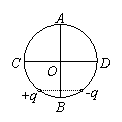 AB,CD为圆的两条相互垂直的直径,圆心为O。将等量q的正、负点电荷放在圆周上的关于AB对称且距离等于圆的半径的位置,如图所示,要使圆心处的电场强度为零,可在圆周上再放一个适当电量的电荷Q,则该点电荷Q