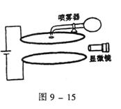 (8分)电子所带电荷量最早是由美国科学家密立根通过油滴实验测出的.油滴实验的原理如图9-15所示,两块水平放置的平行金属板与电源连接,上、下板分别带正、负电荷,油滴从喷雾器喷出后,由于摩擦而带电,油谪进入上板中央小孔后落到匀强电场中,通过显微镜可以观察到油滴的运动情况,两金属板问的距离为d.忽略空气对油滴的浮力和阻力.