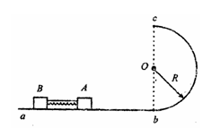 17.(12分)如图所示,ab是水平的光滑轨道,bc是与ab相切的位于竖直平面内、半径R=0.4m的半圆形光滑轨道。现在A、B两个小物体之间夹一个被压缩的弹簧(弹簧未与A、B挂接)后用细线拴住,使其静止在轨道ab上。当烧断细线后,A物体被弹簧弹开,此后它恰能沿半圆形轨道通过其最高点c。已知A和B的质量分别为mA=0.1kg和mA=0.2kg,重力加速度g取10m/s2,所有物体均可视为质点。求: