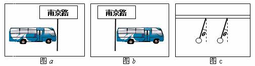 7.如图a、b所示,是一辆质量m=6×103kg的公共汽车在t=0和t=4s末两个时刻的两张照片。当t=0时,汽车刚启动(汽车的运动可看成匀加速直线运动).图c是车内横杆上悬挂的拉手环经放大后的图像,测得θ=150.根据题中提供的信息,可以估算出的物理量有[ ]