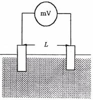 为了利用海洋资源,海洋工作者有时根据水流切割地磁场所产生的感应电动势来测量海水的流速。假设海洋某处地磁场竖直分量为B=0.5×10-4T,水流是南北流向,如图所示,将两电极竖直插入此处海水中,且保持两电极的连线垂直水流方向。若两电极相距L=20m,与两电极相连的灵敏电压表读数为U=0.2mV,则海水的流速大小为[