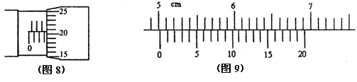 11、(6分)某学生用螺旋测微器在测定某一金属丝的直径时,测得的结果如图(8)所示,则该金属丝的直径d=_________mm。另一位学生用游标尺上标有20等分刻度的游标卡尺测一工件的长度,测得的结果如图(9)所示,则该工件的长度L=_________cm。