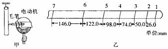 (8分)如图甲所示,用包有白纸的质量为1.00kg的圆柱棒替代纸带和重物;蘸有颜料的毛笔固定在电动机的飞轮上并随之匀速转动,以替代打点计时器.烧断悬挂圆柱棒的线后,圆柱棒竖直自由下落,毛笔就在圆柱棒面的纸上画出记号.如图乙所示.设毛笔接触棒时不影响棒的运动,测得记号之间的距离依次为26.0 mm、50.0 mm、74.0mm、98.0 mm、122.0 mm、146.0 mm,由此可验证机械能守恒定律.已知电动机铭牌上标有“1200 r/min”字样.根据以上内容回答下列问题.
