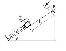 (15分)如图所示,一弹簧在倾角为θ的斜面上,下端固定,上端连接质量为m的滑块A,用一锁定K将A锁定在斜面上,并使弹簧刚好处于原长。在A点之下斜面段光滑,在A点之上斜面粗糙。现将质量也为m的物块B从距离A为L的P点以某一初速度滑下,当B刚要与A相碰瞬间锁定K立即自动解开,使B与A相碰(相碰时间极短),并使A、B以共同的速度压缩弹簧(A、B互不粘连),然后B又刚好被反弹回P点而速度减为零。B物块与粗糙段摩擦因数为μ。求B物原来的初速度大小。