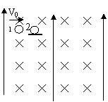 17(16分)、如图所示,在足够大的空间范围内,同时存在着竖直向上匀强电场和垂直纸面向里的匀强磁场,磁感强度B=1.57T,小球1带正电,其电量和质量比q1/m1=4C/kg,所受重力与电场力大小相等;小球2不带电,静止放置于固定的水平悬空小支架上。小球1向右以V0=23.59m/S的水平速度与小球2正碰,碰后经过0.75s再次相碰。设碰撞前后两小球带电情况不发生改变,且始终保持在同一竖直平面内。(g=10m/s2)问: