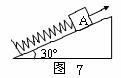 如图7所示,重80N的物体A放置在倾角为30º的粗糙斜面上,有一根原长为10cm,劲度系数为103N/m的弹簧,某一端固定在斜面底端,另一端放置物体A后,弹簧长度缩短为8cm,现用一弹簧秤沿斜面向上拉物体,物体仍静止,若物体与斜面间最大静摩擦力为25N,当弹簧的长度为8cm时,弹簧秤读数可能为:[ ]