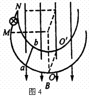 4.(20分)如图4所示,半径为r、电阻不计的两个半圆形光滑导轨并列竖直放置,在轨道左上方端点M、N间接有阻值为R的小电珠,整个轨道处在磁感强度为B的匀强磁场中,两导轨间距为L,现有一质量为m,电阻为R的金属棒ab从M、N处自由静止释放,经一定时间到达导轨最低点OO′,此时速度为v。