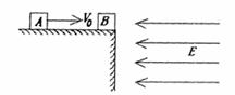 17.(8分)如图所示,在非常高的光滑、绝缘水平高台边缘,静止放置一个不带电的小金属块B,另有一与B完全相同的带电量为+q的小金属块A以初速度v0向B运动,A、B的质量均为m. A与B相碰撞后,两物块立即粘在一起,并从台上飞出. 已知在高台边缘的右面空间中存在水平向左的匀强电场,场强大小E=2mg/q. 求: