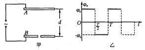 (12分)如图甲所示,A、B两块金属板水平放置,相距为d=0. 6 cm,两板间加有一周期性变化的电压,当B板接地(