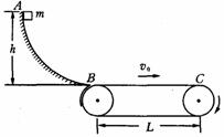 19.(15分)如图所示,一质量为m的滑块从高为h的光滑圆弧形槽的顶端A处无初速度地滑下,槽的底端B与水平传送带相接,传送带的运行速度恒为v0,水平段长为L,滑块滑到传送带上后做匀加速运动,滑到传送带右端C时,恰好被加速到与传送带的速度相同.求: