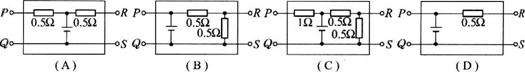 9.有一电学黑箱,内有电池组及定值电阻若干只,以一定方式连接.外有P、Q、R、S四个接头.已知当用电压表测量P、Q间电压时,示数为1.00V;测量R、S间电压时,示数为0.50V.当将一电流表跨接在R、S间时,示数为1.50A(电压表、电流表都可看作为理想的).下图中画出了黑箱内部的四种电路,其中能满足本题所给条件的是图(图中电池组电动势为1.5V,电池组内阻为0.5Ω)( )