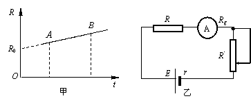 (3) 如图甲是某金属材料制成的电阻R随摄氏温度t变化的图象,图中R0表示0℃时的电阻,k表示图线的斜率.若用该电阻与电池(电动势E、内阻r)、电流表A(内阻Rg)、滑动变阻器R′ 串联起来,连接成如图乙所示
