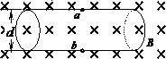 如图为电磁流量计的示意图。直径为d的非磁性材料制成的圆形导管内,有导电液体流动,磁感应强度为B的匀强磁场垂直于导电液体流动方向而穿过一段圆形管道。若测得管壁内a、b两点间的电势差为U,则管中导电液体的流量Q=____m3/s。