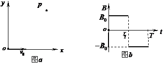 如图(a)所示,在坐标xoy平面内的第一象限内,有一个匀强磁场,磁感强度大小恒为B0,方向垂直于xoy平面,且随时间作用周期性变化,如图(b)所示,规定垂直xoy平面向里的磁场方向为正.一个质量为m,电量为q的正粒子,在t=0时刻从坐标原点以初速度v0沿x轴正方向射入,在匀强磁场中运动,经过一个周期性变化的匀强磁场,变化周期为T(未确定)。粒子到达第一象限内的某一点P,且速度方向沿x轴正方向(不考虑重力).