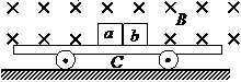 如图所示,有一质量M=2kg的平板小车静止在光滑的水平面上,小物块a、b静止在板上的C点,a、b间绝缘且夹有少量炸药.已知ma=2kg,mb=1kg,a、b与小车间的动摩擦因数均为μ=0.2.a带负电,电量为q,b不带电.平板车所在区域有范围很大的、垂直纸面向里的匀强磁场,磁感应强度为B,且qB=10Ns/m.炸药瞬间爆炸后释放的能量为12J,并全部转化为a、b的动能,使得a向左运动,b向右运动.取g=10m/s2